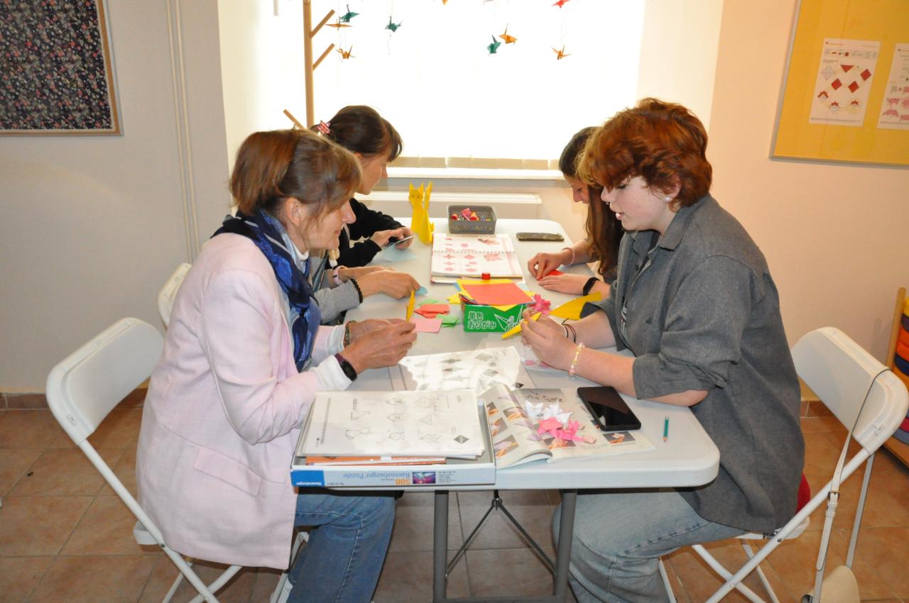 18. května si každý rok připomínáme Mezinárodní den muzeí. Letošní ročník jsme ladili do výstavy Senbazuru: Tisíc origami jeřábů, kterou jsme připravili k připomínce 80. výročí ukončení 2. sv. války. Jako jakýsi mírový manifest. Mluvit o válce a o ceně míru je důležité v každé době. V té dnešní ale obzvlášť. Proto jsme pozvali ukrajinskou malířku Yulii Plotnikovou, aby s námi besedovala o současné situaci na Ukrajině a pověděla nám, jaké to je žít v napadené zemi. Při této příležitosti otevřela svoji drobnou výstavu obrazů s názvem "Yulia Plotniková: Jarní inspirace".