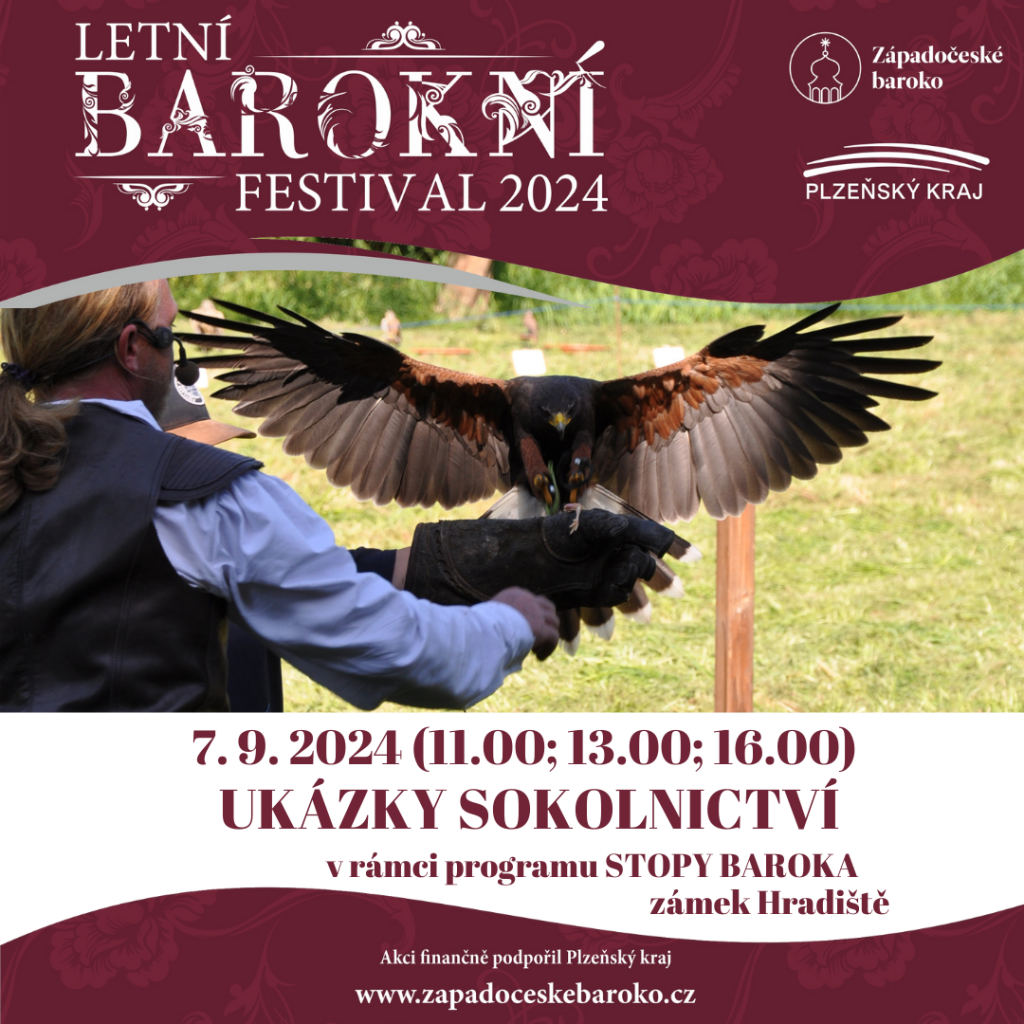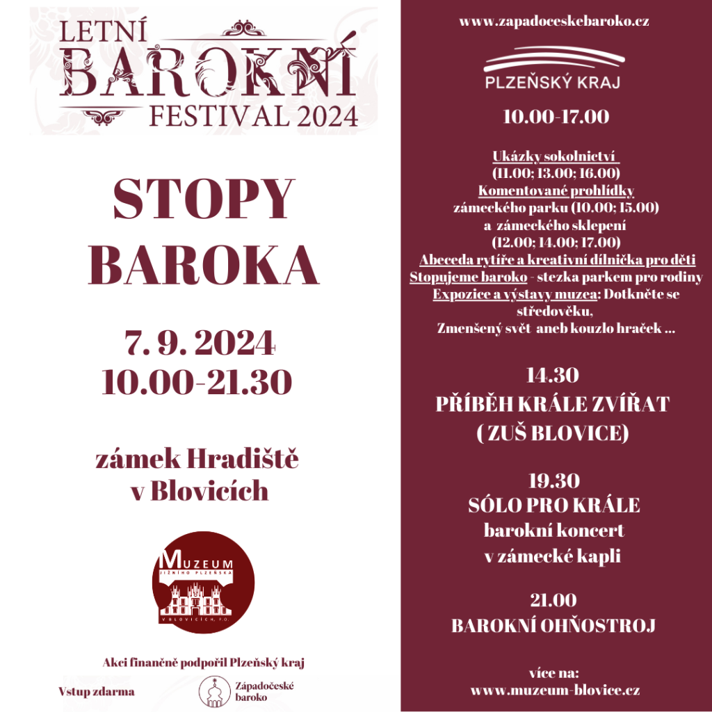 Zveme vás na další ročník Stop baroka. Čekají na vás komentované prohlídky výstavy Dotkněte se středověku, zámeckého sklepení a parku, komentované sokolnické ukázky, tvořivé dílny pro děti, stopovačka v parku, muzikál žáků ZUŠ Blovice, barokní koncert a barokní ohňostroj.